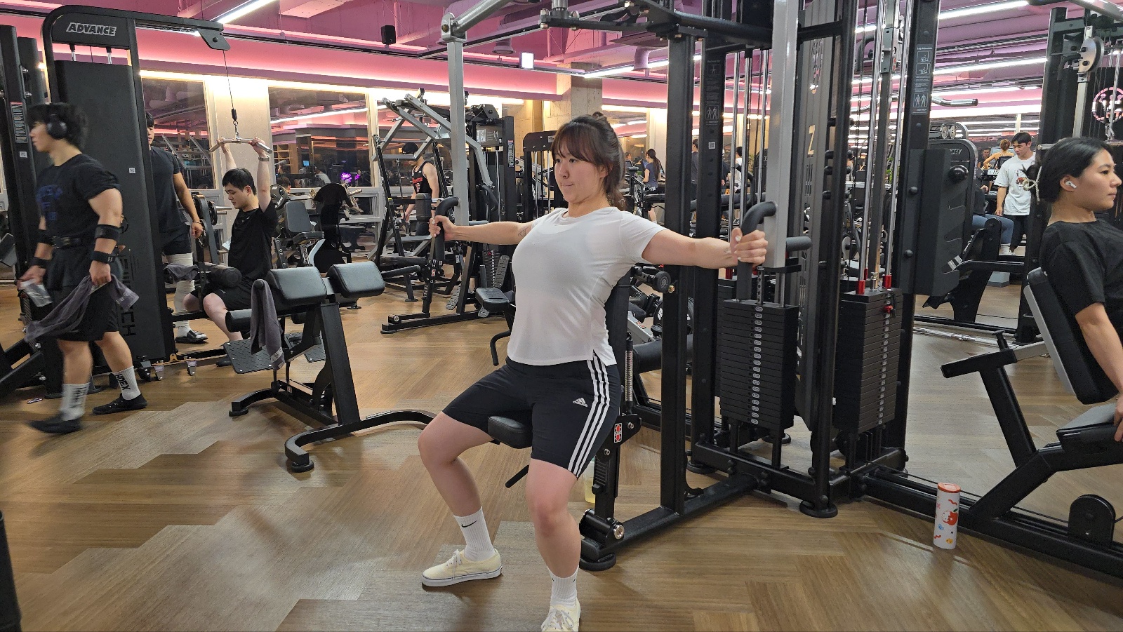 The third exercise used the leverage seated chest press machine available in our fitness space in Beomeo-dong.